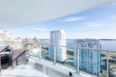 Unidad en GALA TOWER de 3 dormitorios en suite, toilette, cocina definida, amplio living-comedor, terraza con excelente vista panoramica a la Mansa, parrillero propio. Ubicación privilegiada al lado del Hotel Enjoy, a pasos del mar. Ideal para vacacionar. Cuenta con WiFi y garage.